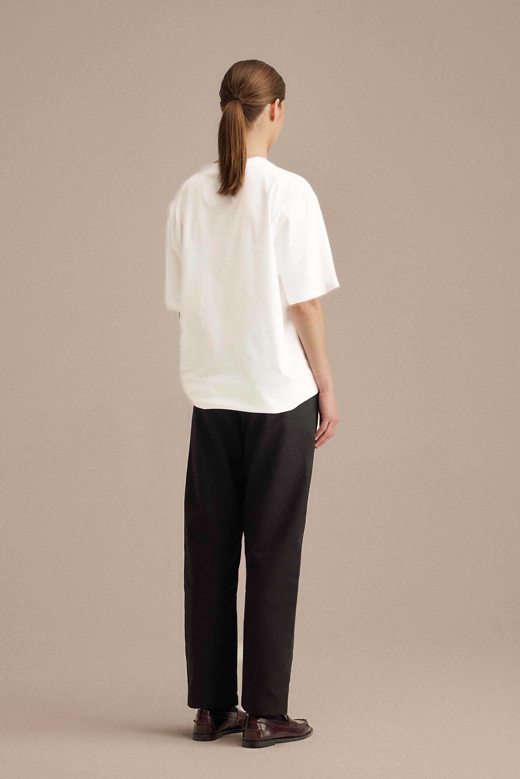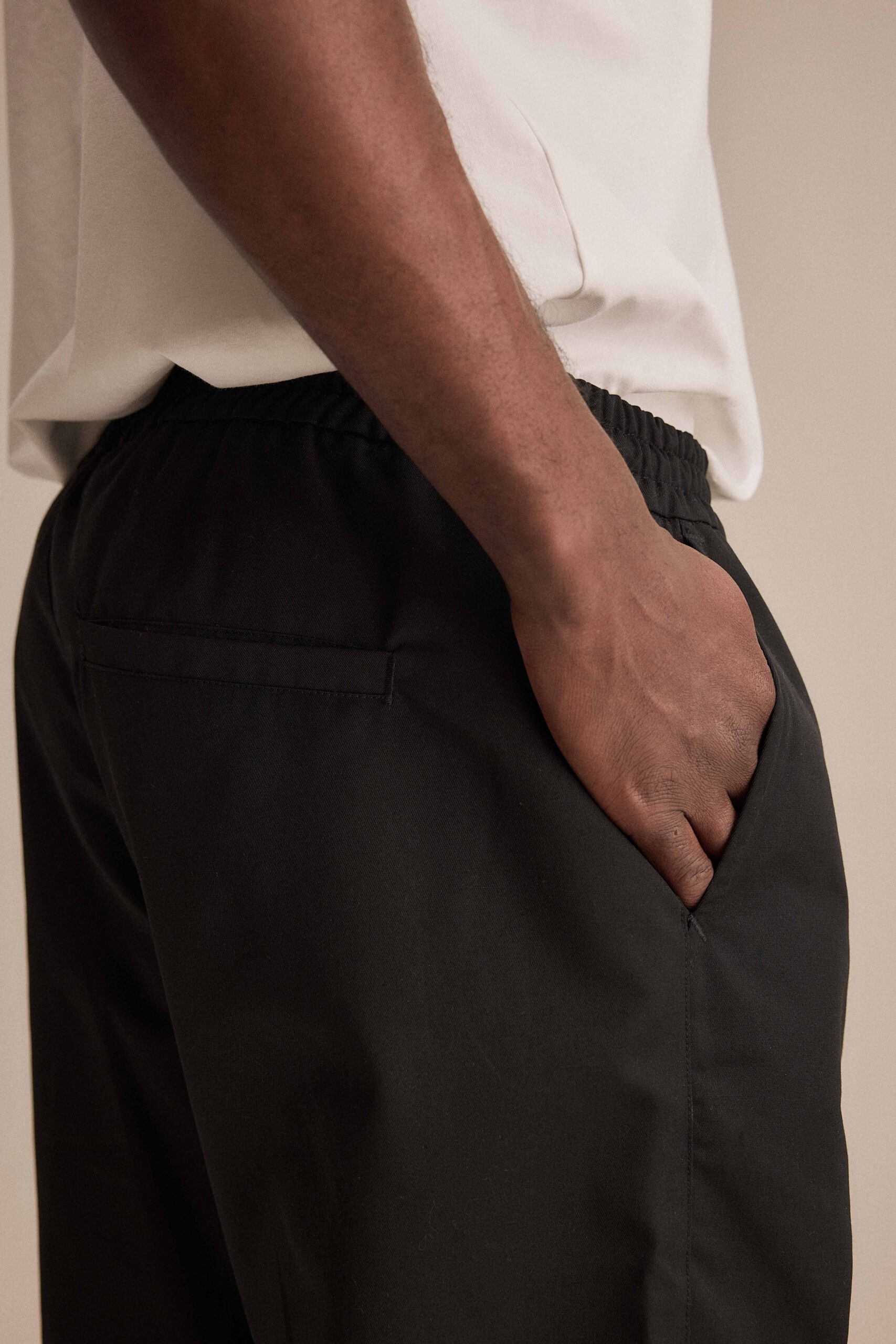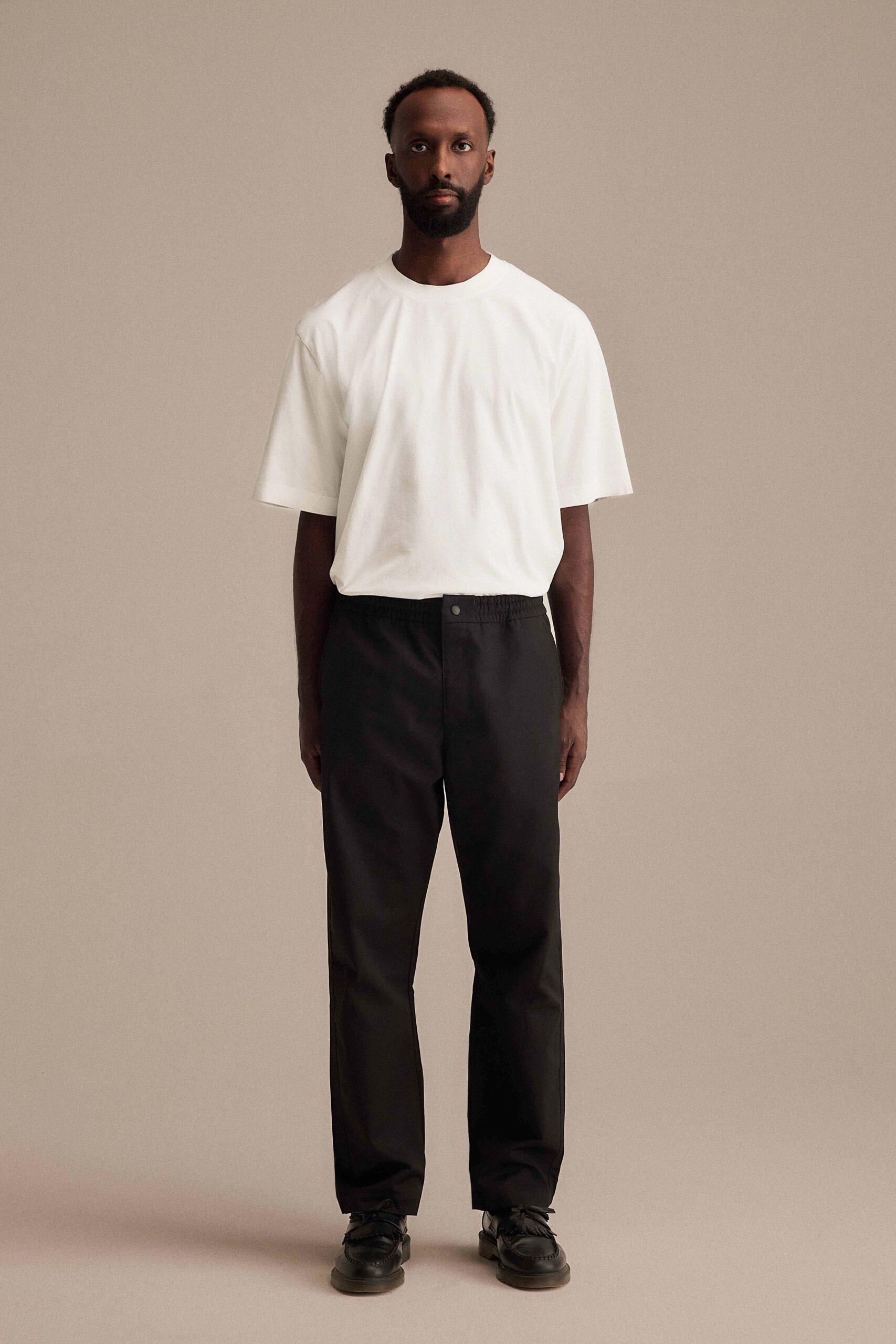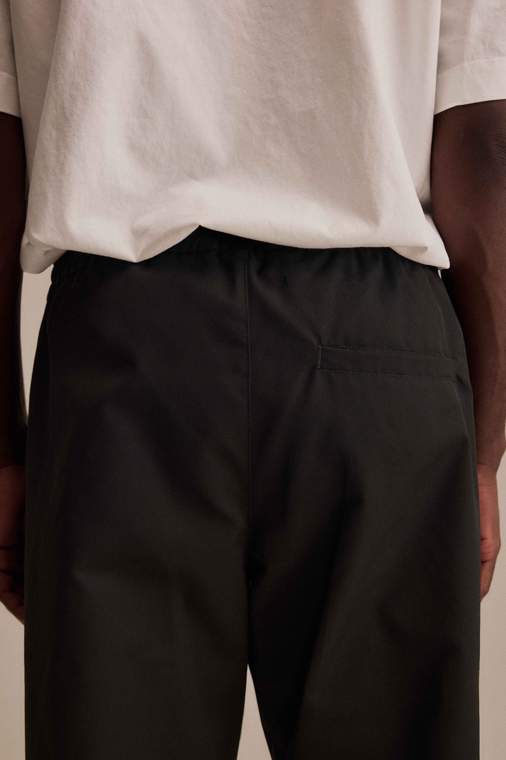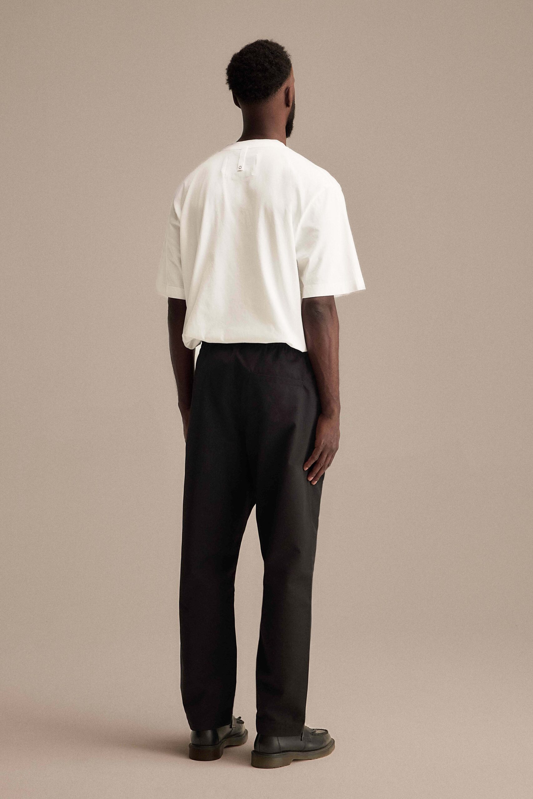 Adjustable trousers with elastic and hidden drawstring inside waistband, slanted front pockets and a welt pocket at back. Fabric produced in Frosinone, Italy by Klopman international SRL and garment made in Guimarães, Portugal by Confecções Mafrex LDA.